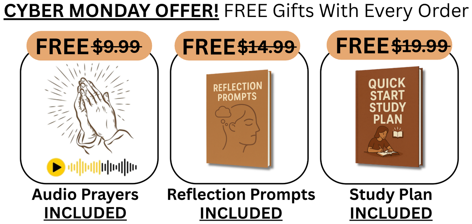 With your order, you’ll also get three bonus tools to help you go deeper: Audio Prayers (short, guided prayers you can listen to anywhere), Reflection Prompts (thought-provoking questions to help you apply what you’ve learned), and a Quick Start Study Plan (a step-by-step reading path to keep you consistent). Together, these resources make it easier to understand, reflect on, and live out God’s Word.